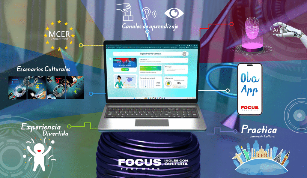 Nuestro ecosistema digital reúne Inglés FOCUS Campus (web) y la OLA App para practicar donde estés. Lecciones guiadas, escenarios culturales interactivos, prácticas en vivo y feedback con IA, todo alineado al MCER. Avanzas con una ruta clara: metas semanales, seguimiento y actividades divertidas que mantienen la motivación.